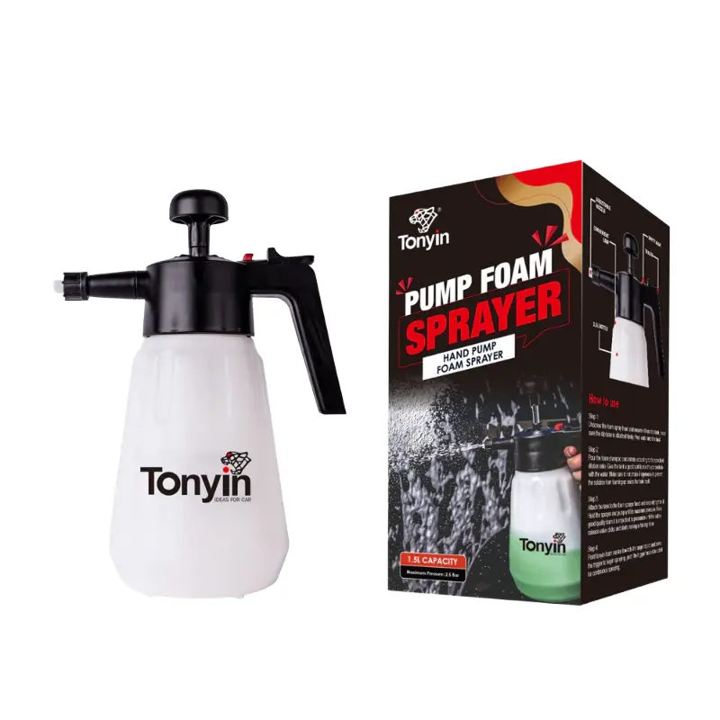 Pulverizador de bomba portátil utilizado para cuidados automóveis, limpeza doméstica e industrial Não é necessária uma lavadora de alta pressão ou um canhão de espuma Um design portátil e elegante permite que seja guardado numa bolsa de ferramentas. Fácil de limpar e manter. Uma ferramenta de solução de espuma para a limpeza de rodas, exteriores, estofos e tecidos. Também frequentemente utilizado em casa, no jardim e em tempo real. Especificações: Volume do tanque: 0,25 G, Dimensões: 11,3 x 6,7 x 6,5 polegadas, Peso: 1,41 libras Função: Pulverizador de compressão de 1,5L para uso interior e exterior. Este pulverizador robusto é adequado para relvados e jardins. As aplicações adicionais incluem a limpeza e manutenção de automóveis. Ao contrário de outros pulverizadores de espuma invisíveis, este pulverizador de pressão com bomba de espuma contém um frasco translúcido com uma escala de calibração. Pode verificar facilmente o nível do fluido e saber exatamente quando deve reabastecer. Frasco translúcido do pulverizador de espuma Pode verificar facilmente o nível do fluido e saber exatamente quando deve reabastecer. Fácil de bombear. Pode pulverizar facilmente simplesmente bombeando para cima e para baixo várias vezes. O frasco de espuma pulveriza compostos finos e suaves. Interruptor bloqueável – botão que poupa trabalho. Quando o interruptor é empurrado para a frente, pode ser bloqueado e as mãos podem ser libertadas e pulverizadas automaticamente.
