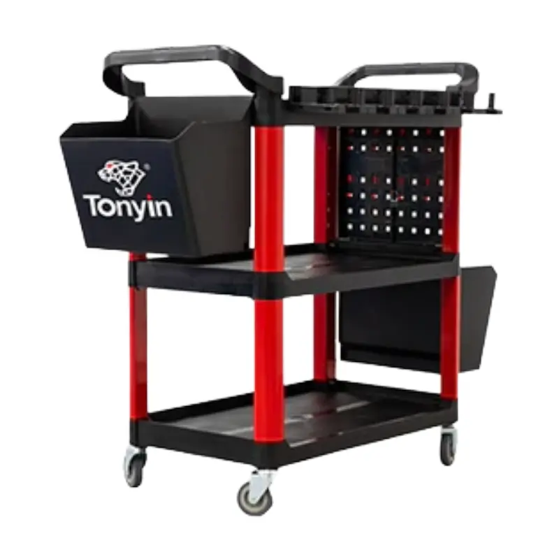 O carro de apoio de detalhamento tem como função colocar e organizar os teus polishs, escovas, luvas, boinas e polidoras enquanto efetua as suas tarefas. Agora com 2 painéis laterais para colocar ganchos (fornecidos) e assim poder pendurar convenientemente os diversos utensílios como luvas, pincéis, escovas e mesmo algumas maquinas mais leves. Montantes de plástico durável fáceis de montar sem problemas de corrosão. Pega de um dos lados permite versatilidade, e mais mobilidade devido às quatros rodas direcionais tendo duas delas travão para imobilizar o carrinho com segurança. Com 3 prateleiras este carro também serve para arrumação de longo termo se ficar sem mais espaço disponível nas prateleiras da sua garagem, tornando-o numa autentica “caixa” de ferramentas.